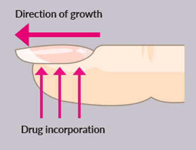 Incorporation of substances into nails mainly occurs through diffusion from the blood supply, which deposits substances to both the germinal matrix and the nail bed on the underside of the nail plate. Nails grow at a continuous rate; the average growth rate is 3 mm a month for fingernails and toenails at 1.1 mm a month.